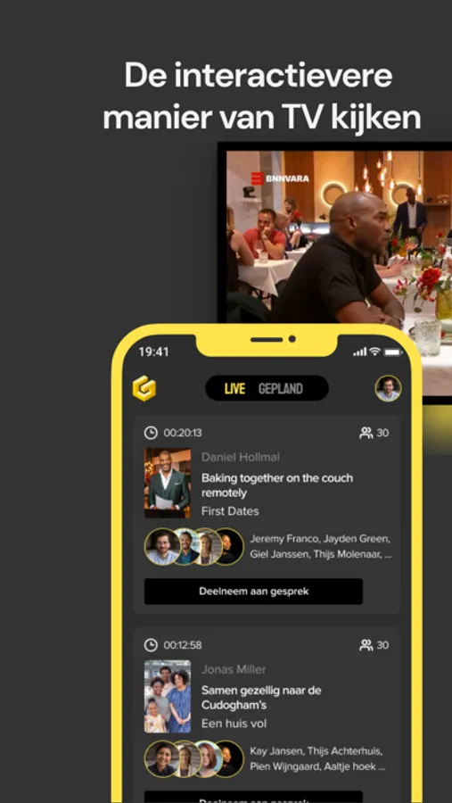 Deelnemen aan live gesprekken: Met onze live categorie kun je zien welke gesprekken momenteel actief zijn en direct deelnemen. Zo kun je met andere kijkers van dezelfde programma praten en de ervaring verrijken.