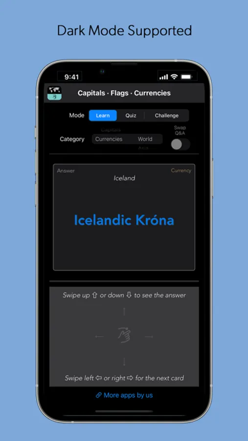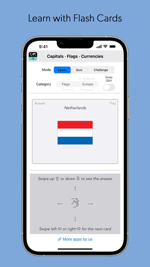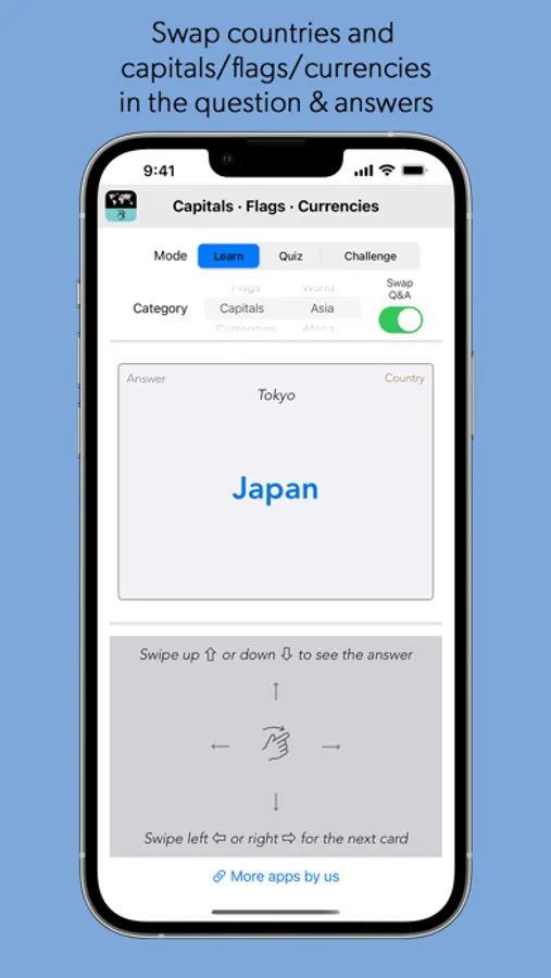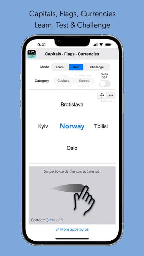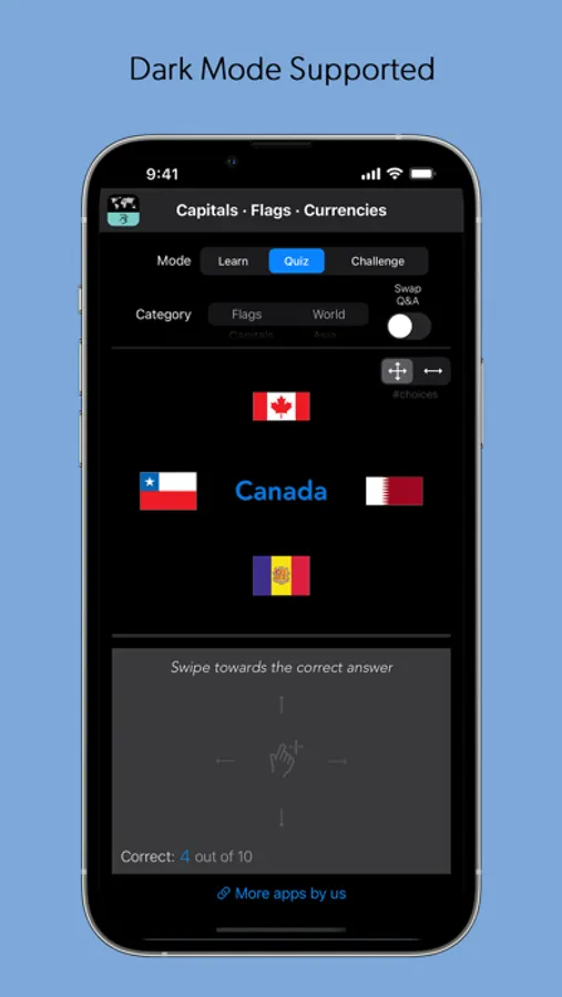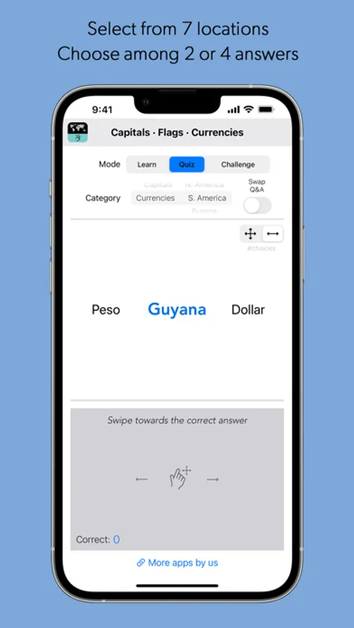 • 2 swipe modes: 4 answer choices or 2 answer choices (for Quiz & Challenge modes)