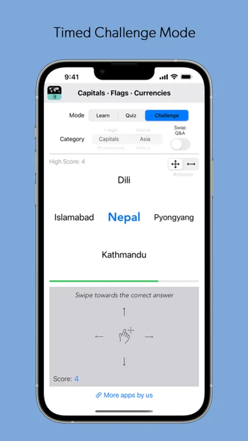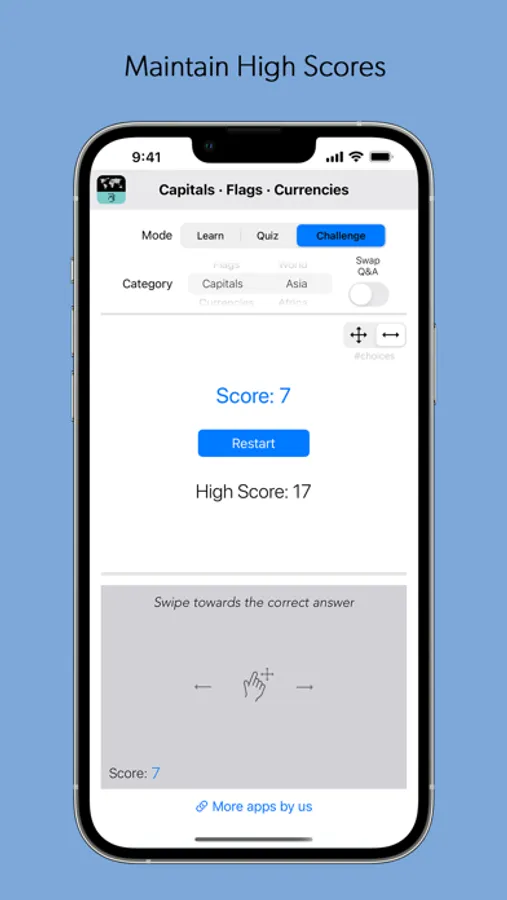 • High scores are maintained in each section (capitals, flags, currencies) for each combination of location and swipe mode, in the Challenge mode