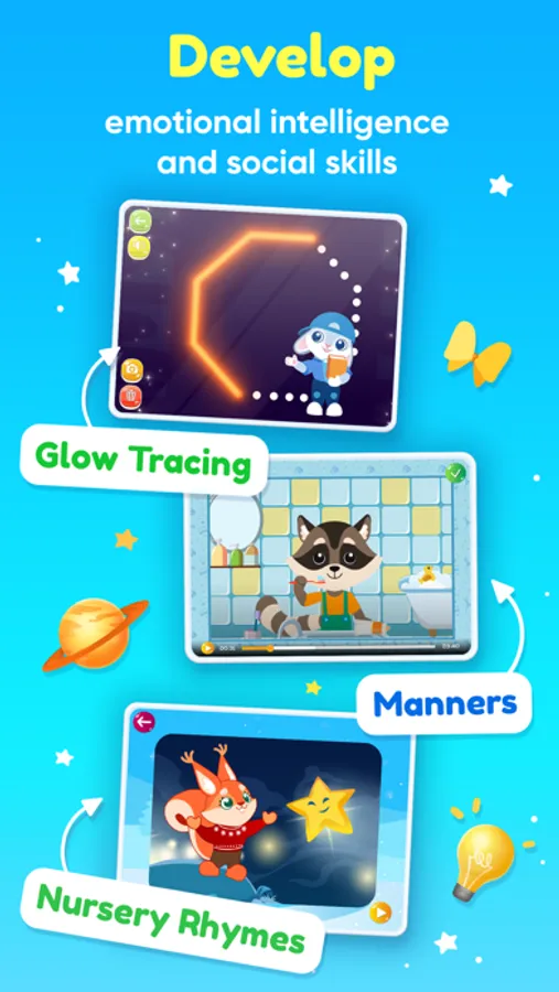 Jigsaw Puzzles, Animals, Colors, Shapes, Drawing, Nursery Rhymes, Counting games, Math games, Alphabet games, Sorting Games, Music Instruments, Memory gyms, Books, Flashcards Games, Cartoons, Sorting Games,Coloring draw by number, Phonics games,Tracing games, Glow-coloring games,Emotions game, Video Lessons