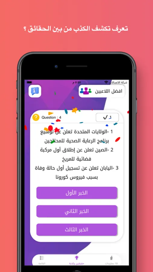 لعبة حقيقتين وكذبة لعبة كلاسيكية مسلية تكون طريقة لعب هذه اللعبة كتالي يبدا اللاعبين بتسجيل الأسماء وبعدها يقع اختيار عشوائي على لاعب واحد ويقول اللاعب ثلاث اخبار اثنين منها صحيح وخبر واحد كذب ويقوم بإضافة هذه الخبر في اللعبة وبعدها يخمن اللاعبين الخبر الخير صحيح