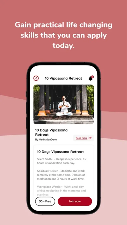 Access Vipassana Meditation for free and learn to meditate. Develop yourself personally and challenge your "normal". Connect with a powerful and inspiring community and become a leader!