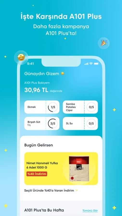 Neler yok ki... Bol bol bakiye kazandıran bir sürü ürün var. Eee yepyeni uygulamanın kendine has bir afişi olmasın mı? Ana sayfadaki A101 Plus’ta Bu Hafta ürünleri sana bakiye kazandırıyor.