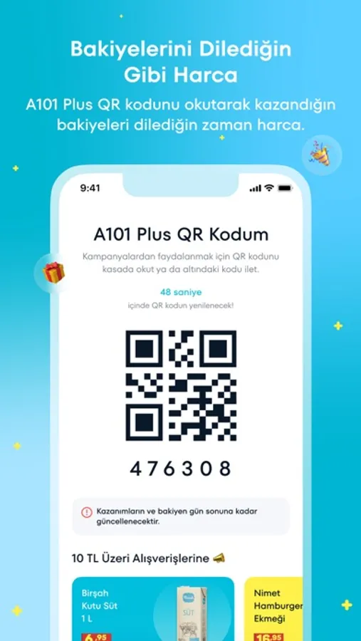 Alışverişlerin sana bakiye kazandırıyor desek? Çok iyi değil mi? A101 Plus’ta Bu Hafta ürünleri ve sana özel kampanyalar bakiye kazandırıyor. Daha çok bakiye için her gün uygulamanı kontrol et. Bakiye kazanacağın kampanyadaki ürünlerden al, bol bol bakiye kazan.