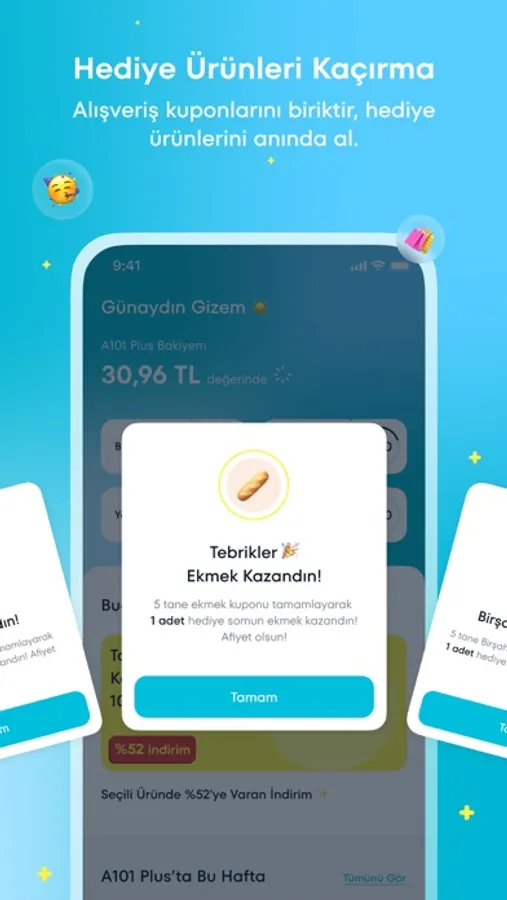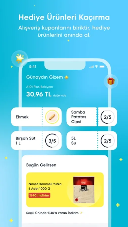 Ekmek, 5 L su ve diğer ürünlerden 5 farklı günde satın aldığında bu ürünlerden bir adet hediye ediyoruz. “Her gün mü almam gerekir?” dediğini duyar gibiyiz. Hayır tabii ki! Sen ihtiyacın olduğunda al, ilerlemeni takip et. Her alışverişindeki bu ürünler bir kupon kazandırır. 5 Kupon 1 hediye ürün! Sen hediye ürün kazandığında, kuponun yırtılarak sana haber verecek.