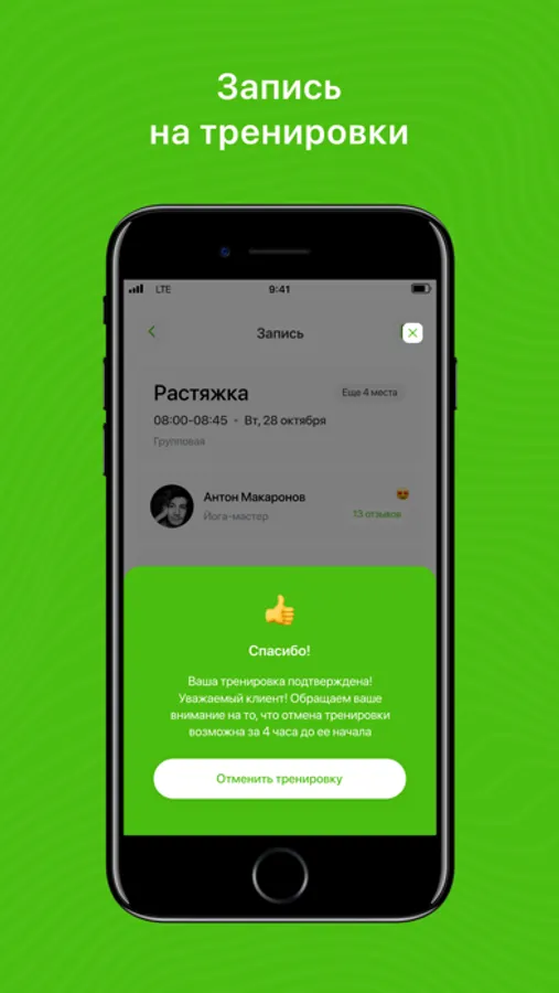 - Получать PUSH-уведомления о предстоящей тренировке;