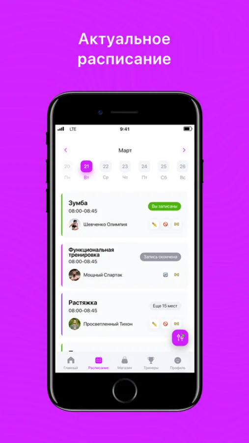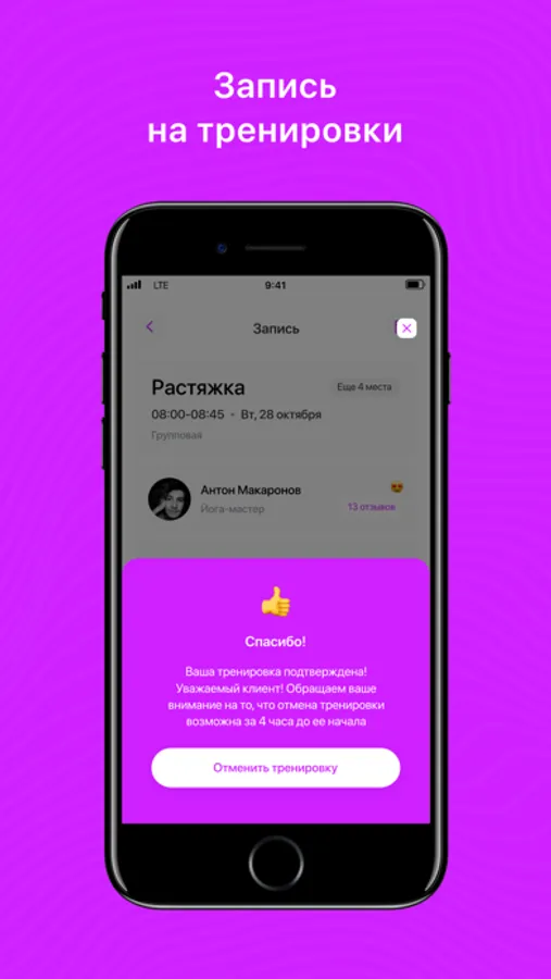 - Получать PUSH-уведомления о предстоящей тренировке за 3 часа;