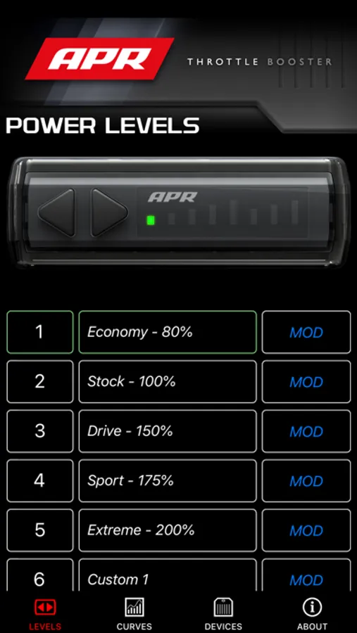 This all works via Bluetooth to the APR Throttle Booster Module. It plugs into your factory throttle harness and then communicates wirelessly with the app and the included wireless switch, giving you multiple methods to quickly change profiles. With most vehicles on the market today offering such an undesirable throttle pedal response profile, you’ll love having the ability to adjust it on your own. And don’t worry, our intuitive guides and tutorials make adjustments a breeze!