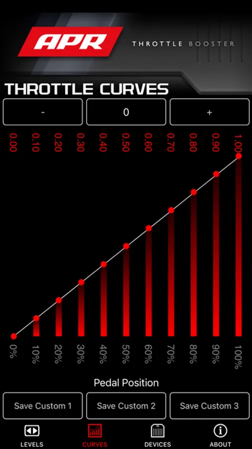 The APR Throttle Booster app allows you to wirelessly tune your vehicle’s throttle pedal for an instant response and finely tuned sensitivity to your desire. The app comes pre-loaded with 5 preset throttle response curves. Optionally you can tune the profile on your own. Go soft or lightning-fast – it’s your choice!