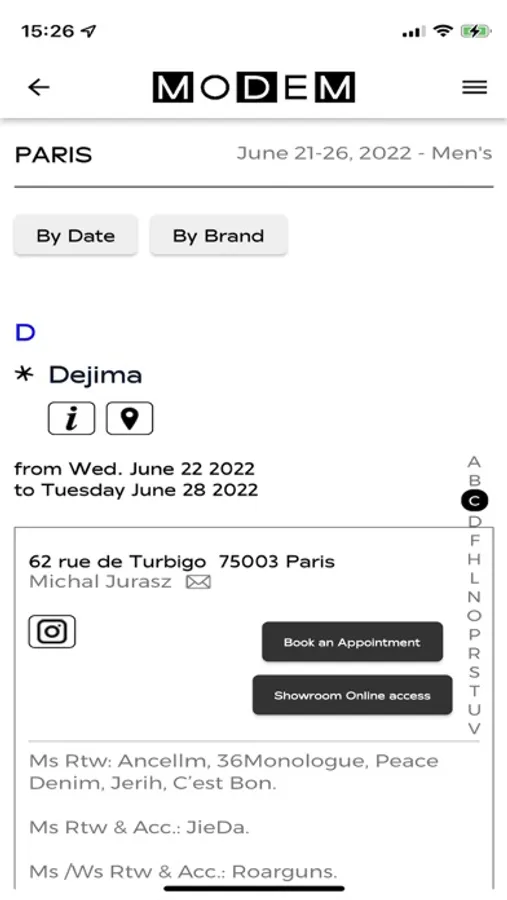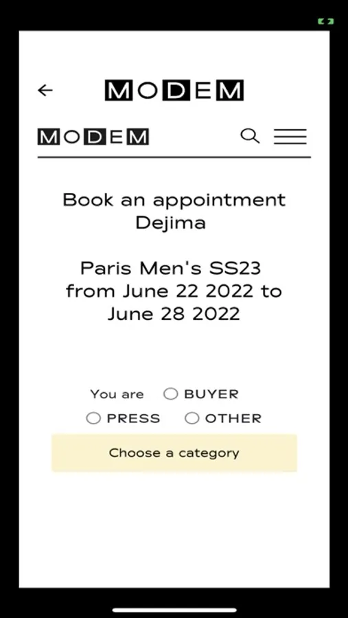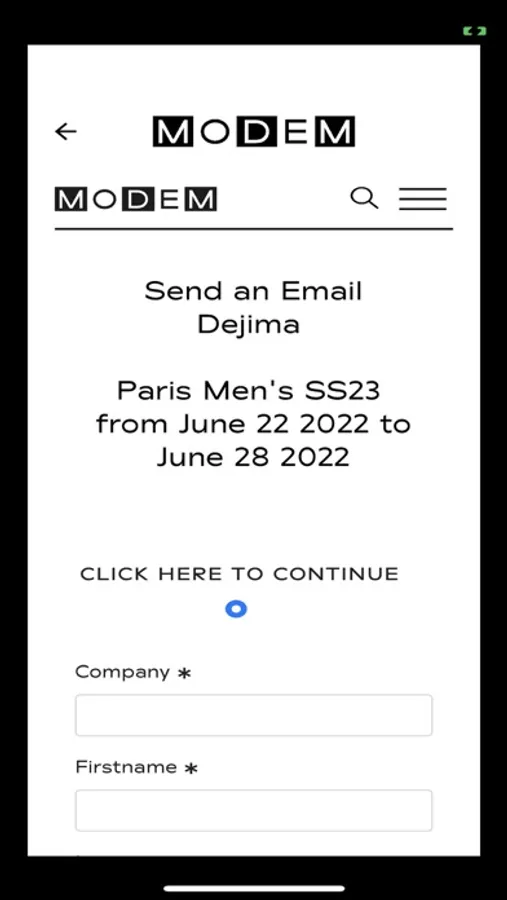 “Modem - The Fashion Network” allows you to search our network on the go, even offline, and to find contact details, company snapshots, and recommendations for restaurants, hotels, spas, shopping, art & culture, nightlife. You can also contact them via online forms, book an appointment, access your online showroom or complete an online visit registration.