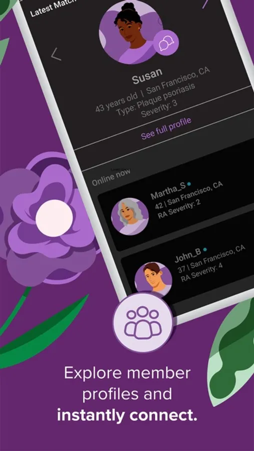 Let us connect you with a new member from our community every day. We’ll recommend members to you based on your treatment plan, lifestyle interests, and needs. Browse member profiles and request to connect with anyone from our community with members listed as “Online Now.”