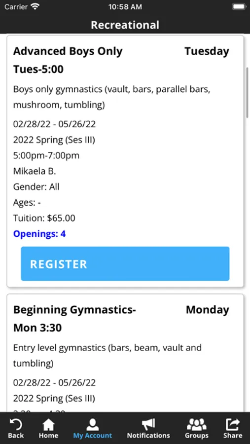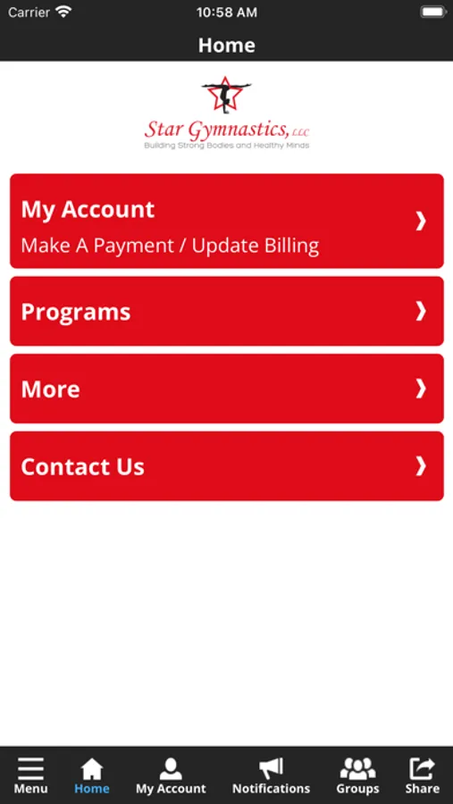 The Star Gymnastics app allows you to manage your account with ease, register for classes, parties, and special events. You'll also receive important notifications about class changes, closings, registration openings, special announcements, and upcoming events.