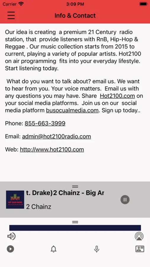Our idea is creating a premium 21 Century radio station, that provide listeners with R & B, Hip-Hop & Reggae . Our music collection starts from 2015 to current, playing a variety of popular artists. Hot2100 on air programming fits into your everyday lifestyle. Start listening today.