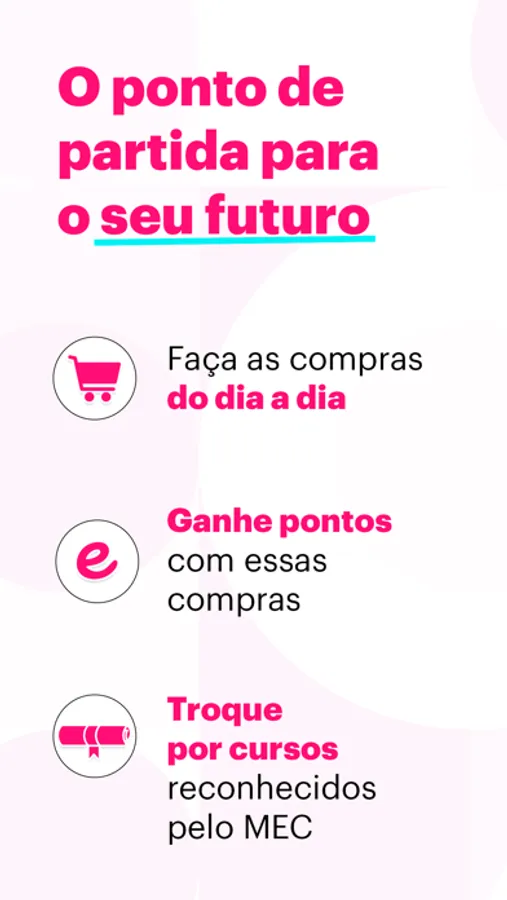 PontoE é um programa de fidelidade inédito focado em Educação, que transforma um percentual do valor das despesas do dia-a-dia das famílias e das compras feitas em centenas de lojas ("cashback") em pontos que nunca expiram.