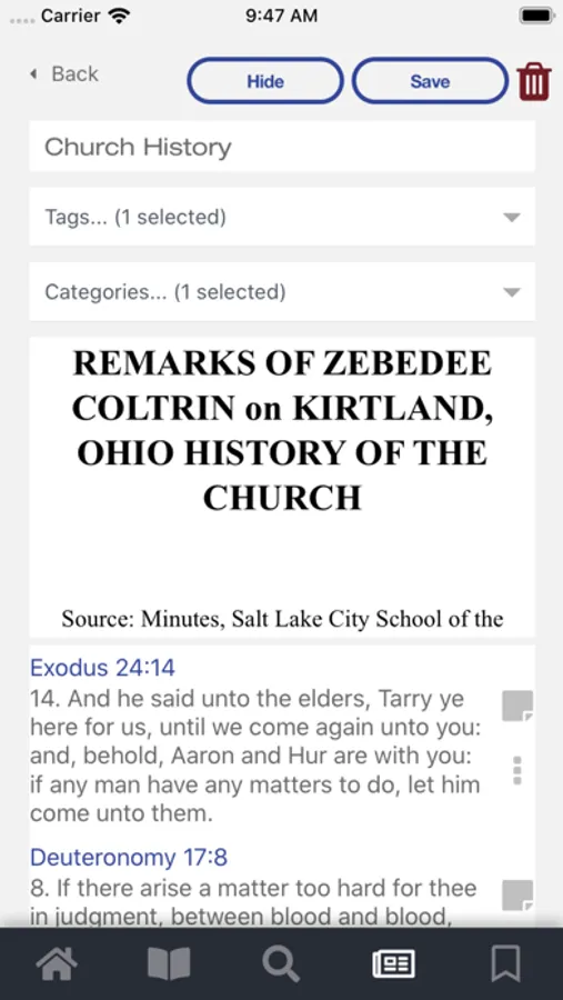 Scripture Notes’ unique instant note system gives you the ability to quickly record all your inspiration on any verse, even inside search results. It features Boolean search for complex search queries, instant access to outside resources like Webster’s 1828 dictionary, Blue Letter Bible for Hebrew and Greek definitions, Bible Hub for 29 Bible translations, and for those in the Church of Jesus Christ of Latter-Day Saints, you can access the LDS Citation Index project and the complete Joseph Smith Translation.