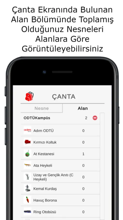 In order to participate in the sweepstake, at least 20 of the "Science Tree" object, at least 20 of the "Hocam in a Speech Bubble" object, at least 20 of the “Horse Chestnut” and at least one of the remaining 7 objects (AdımODTÜ Logo, Red Armchair, Ata Statue/Tri-colored stick, Space and Youth Monument(C Statue), Kemal Kurdaş, Carrot Borona and Blue Ring Bus), at least 67 objects will be collected, with at least 1 each.