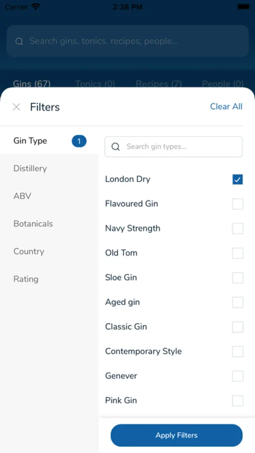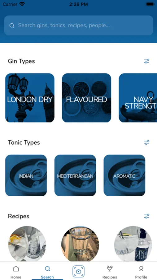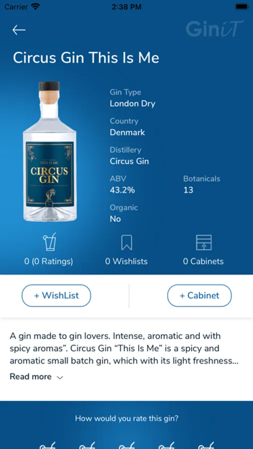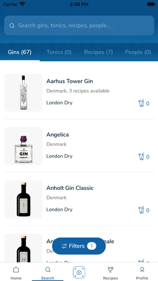 Search by scan, choosing a categori or typing. Use the filter and search among type of gin, distillery, ABV, number of botanicals, country and rating.