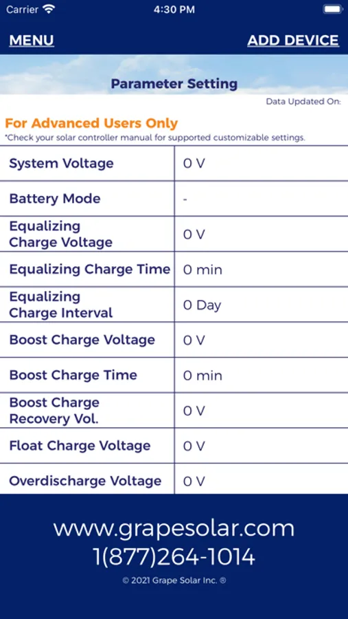 GrapeSolar APP is used as a remote display and operation panel for the relevant solar charge controller (an external or inbuilt BT module is required for usage). By operation on this APP, you can check the status of PV, battery, DC load for the solar DC charge system with charge controller.