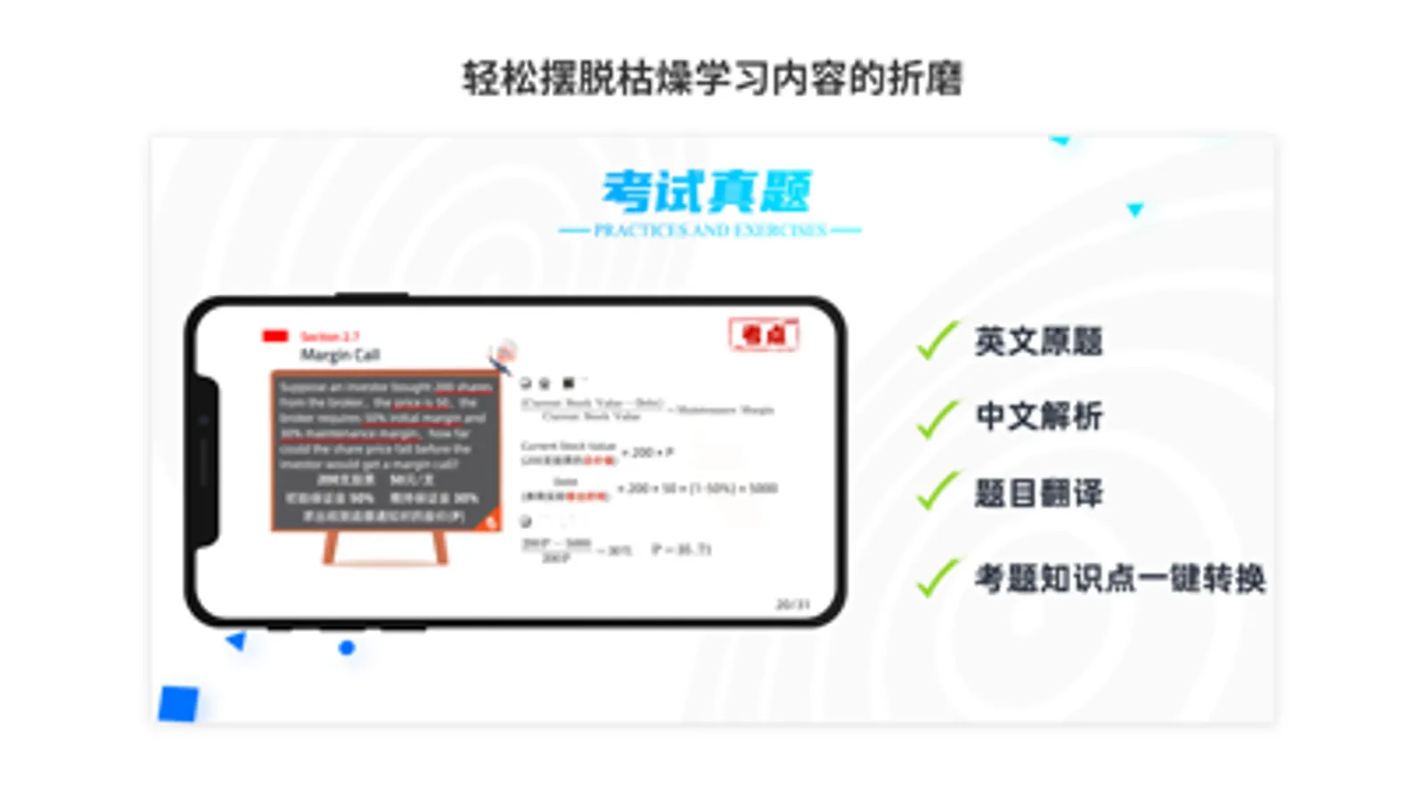 5、学习、刷题两不误我们为大家提供不同难度的考试真题,英文原题加中文解析,还有贴心的题目翻译、考题-知识点一键转换等功能。让学习刷题两不误,考试拿分信手拈来。