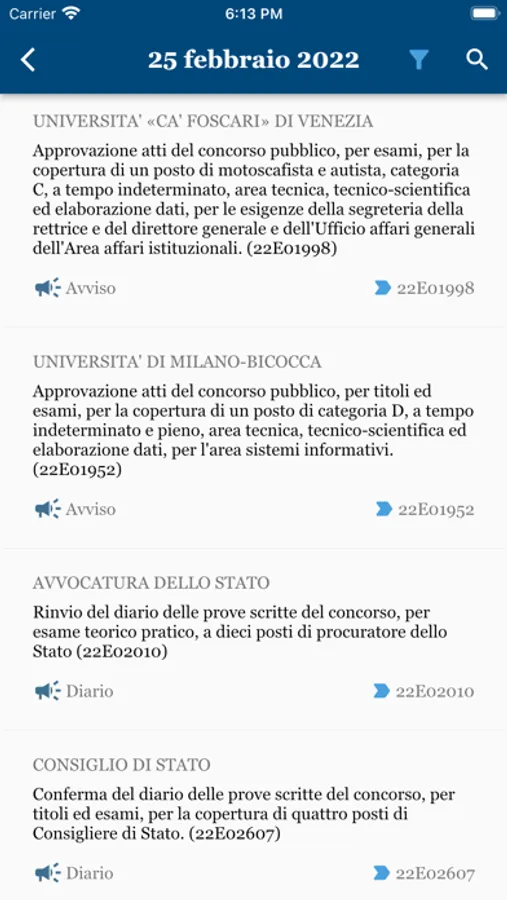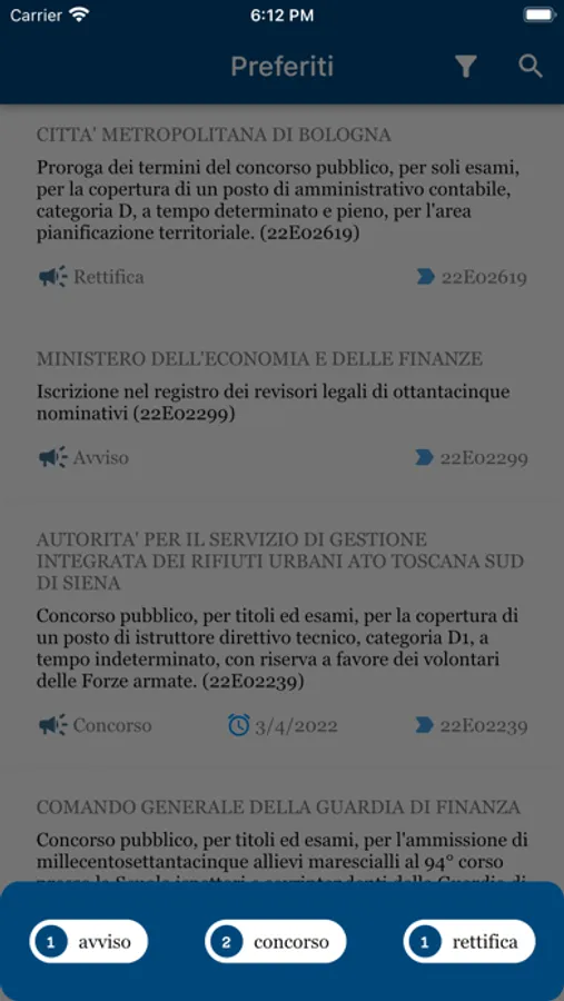 Inoltre, tutti gli avvisi di ogni singola gazzetta sono suddivisi per categorie (Concorsi, Avvisi, Graduatorie etc.) ed è possibile filtrare ogni categoria di avvisi per area di interesse (Enti pubblici, statali, università, etc.).