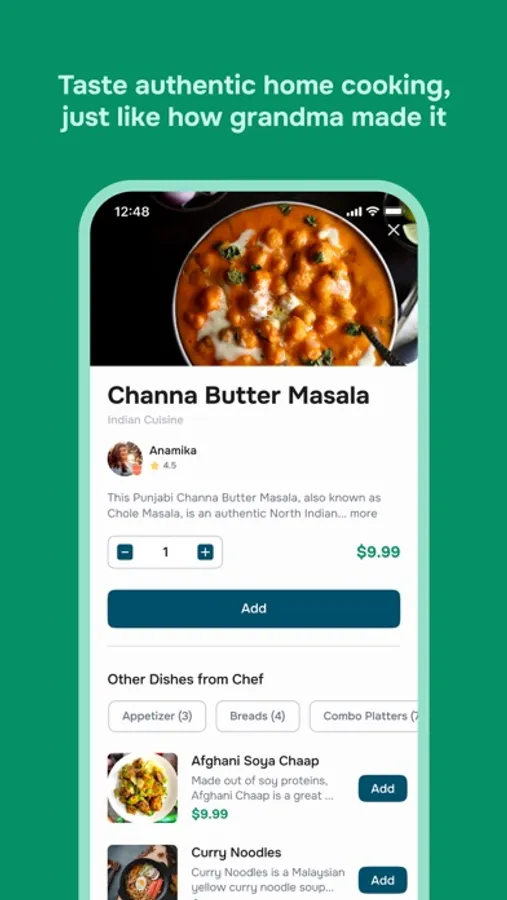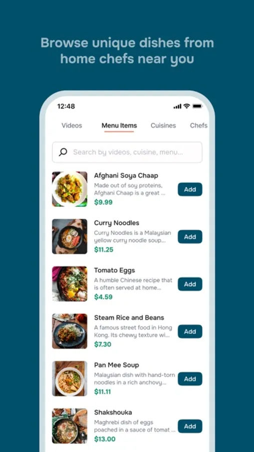 Explore unique dishes of food cooked by home chefs in your neighborhood by watching engaging videos that are created by the community (chefs & users). See something tasty you’d like to try? Place an order directly from the video feed and schedule your home delivery with our easy checkout experience.