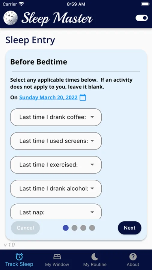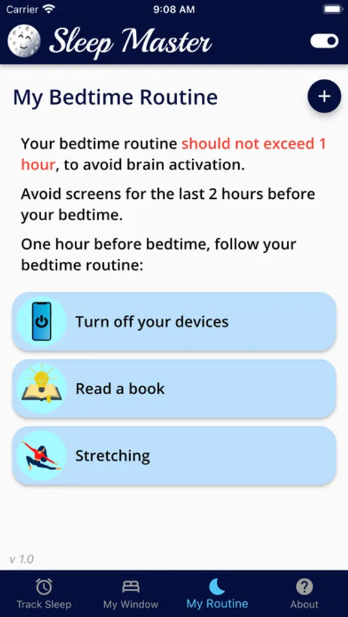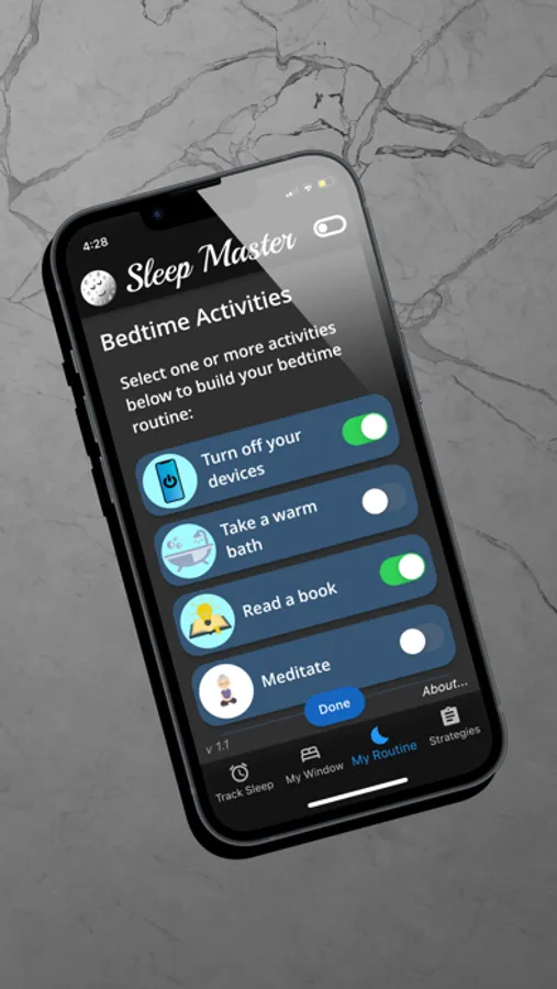 Sleep Master helps you analyze your current sleep patterns to improve your sleep by calculating an optimal sleep window. You can track your sleep for several nights to see trends in your sleep habits. As a sleep aid, Sleep Master also gives you a set of strategies to build a successful bedtime routine, so that you can enjoy an uninterrupted, restful night.