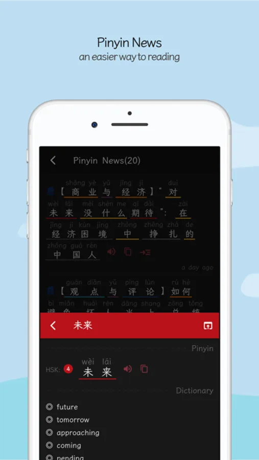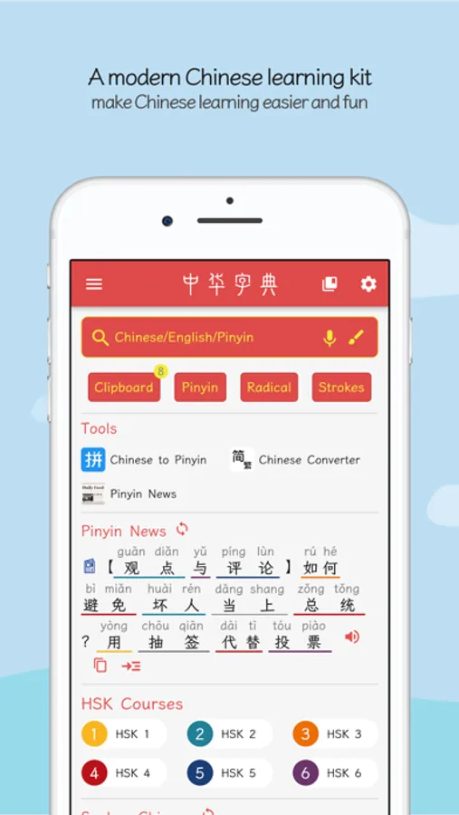 - Pinyin News: dual news with pinyin, makes reading easier.