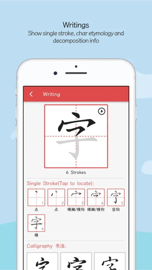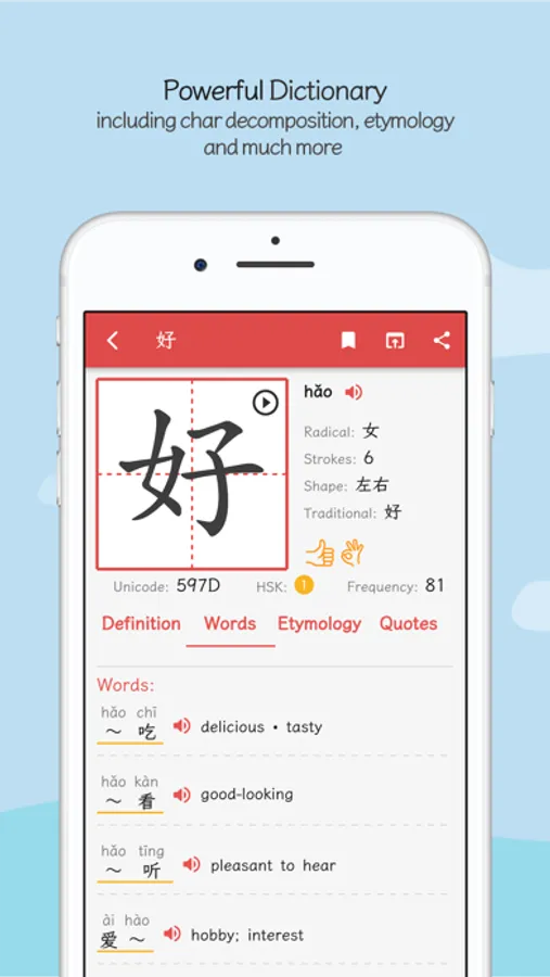 - Powerful Dictionary: not only are there rich examples, but also more content such as character decomposition, etymology, calligraphy, and so on.