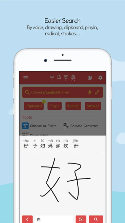 - Easier Search: search by voice, drawing, clipboard, pinyin, radical, strokes and more.