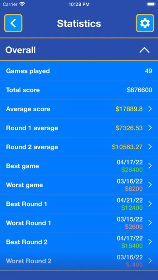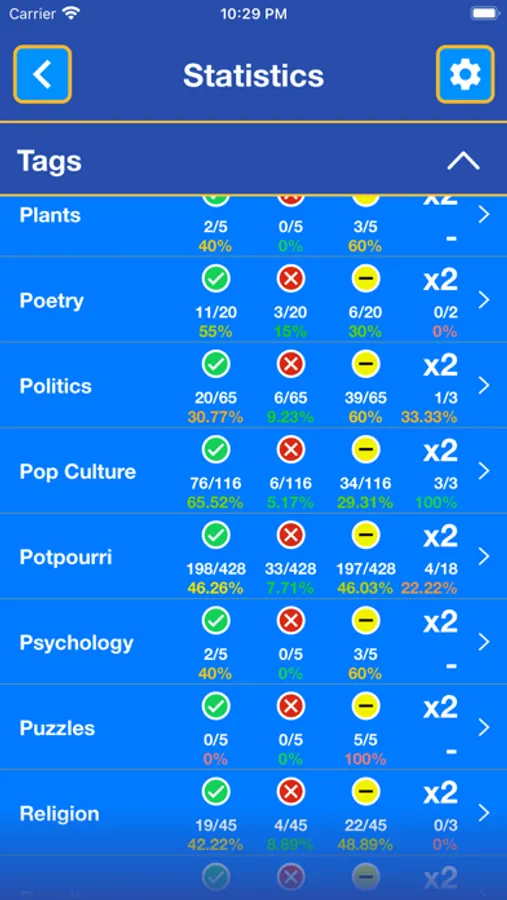 Coryat Scorer lets you track your performance across games of Jeopardy! See your performance across categories, graph your progress over time, view statistical breakdowns, and more.