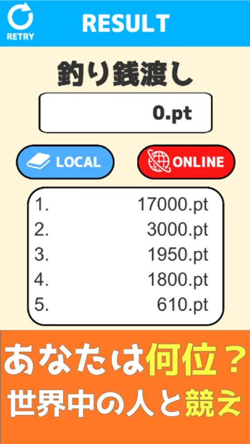 いかに素早く、たくさんのお釣りの計算ができるかに挑戦するゲームです。