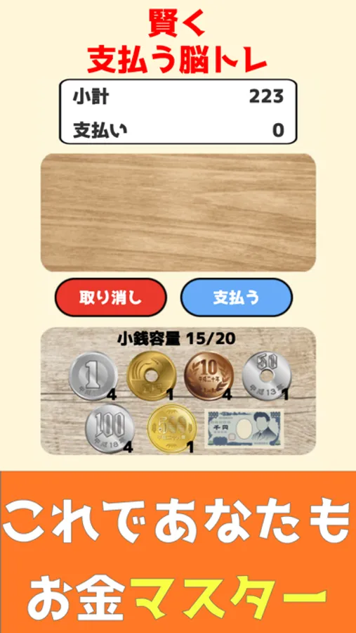 いかに小銭を増やさないように支払いができるかに挑戦するゲームです。