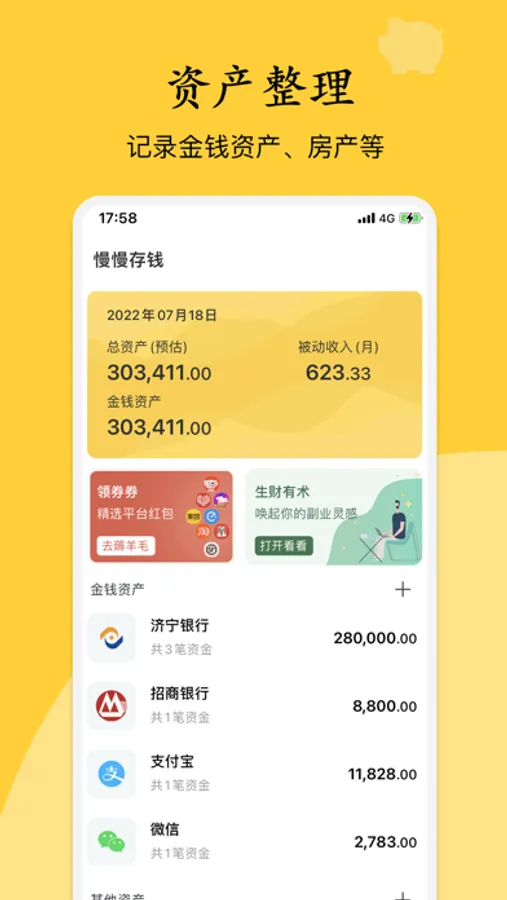 整理我们所有的资金账户(包括银行卡、现金、互联网账户等),固定财产(包括不动产、车辆、黄金等等)。