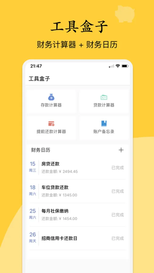 - 财务日历:添加每月还房贷、车贷、信用卡的日历,提醒每月还款。