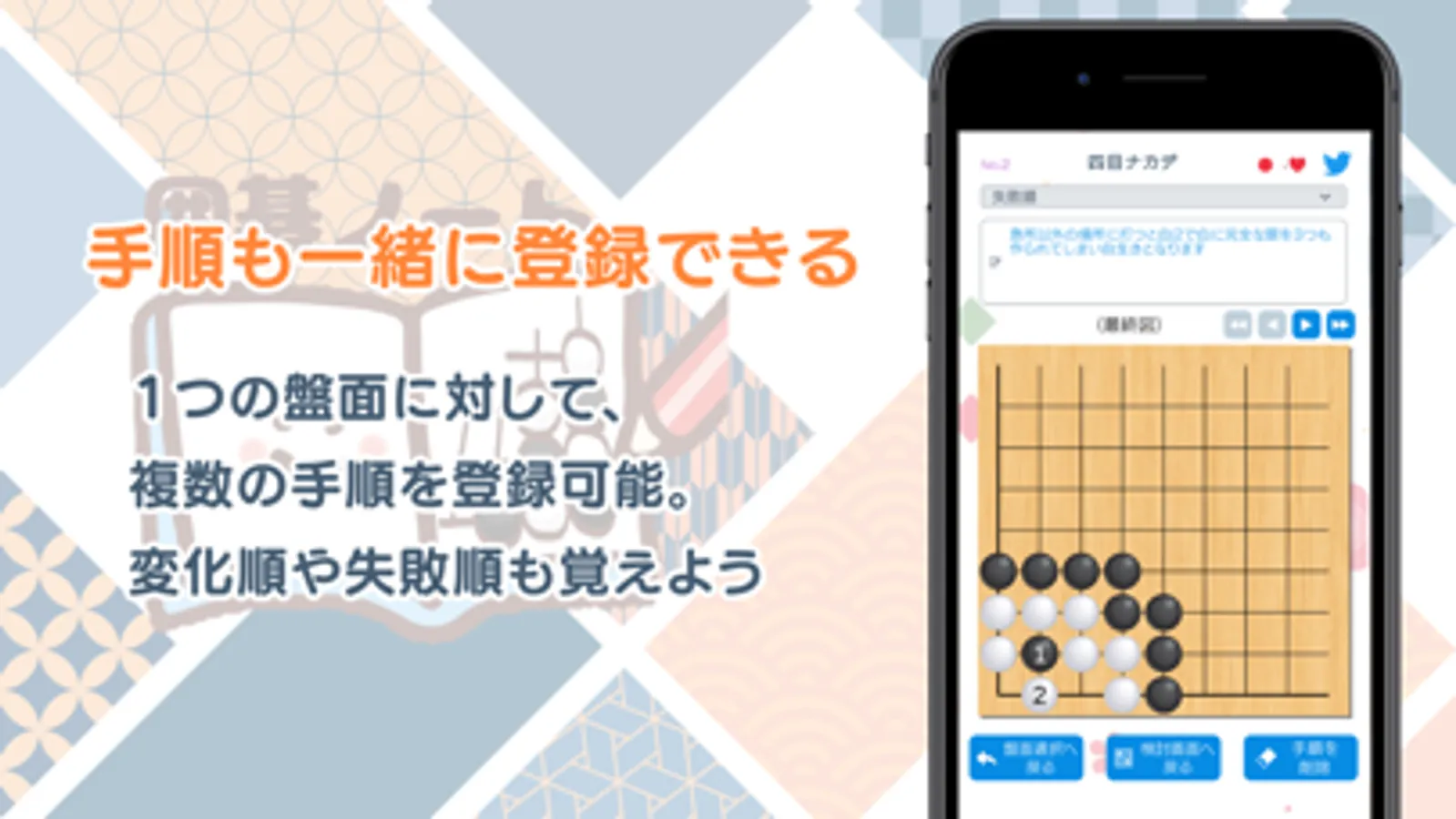 ・登録した盤面から実際に囲碁を打ち進めて手順の検討をすることができます