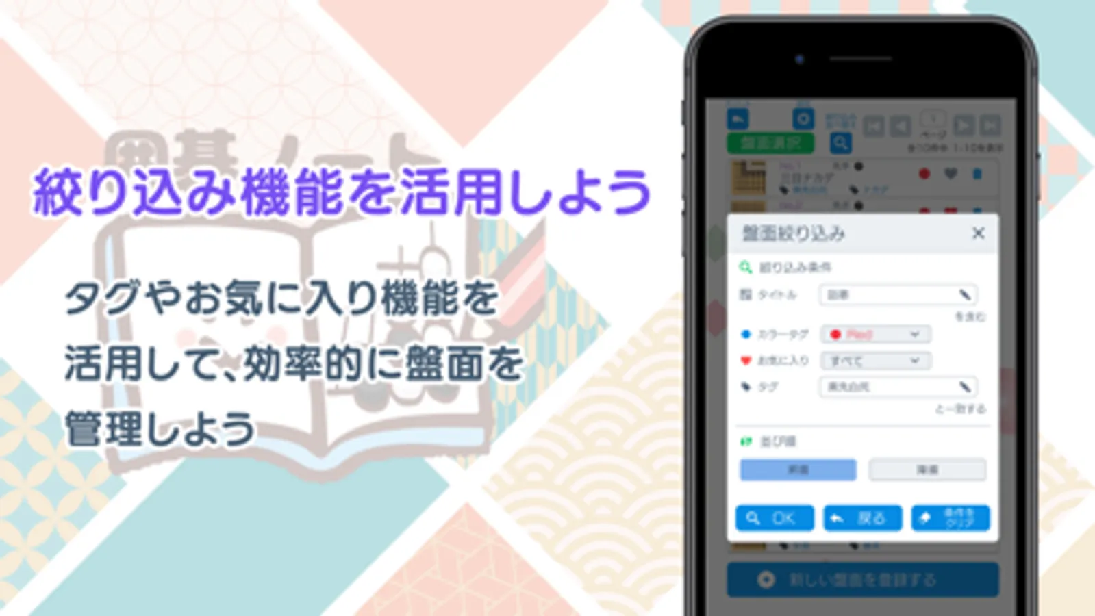 ・盤面絞り込み機能を実装しています。タイトル、カラータグ、お気に入り、テキストタグなどで登録した盤面の絞り込み(フィルタリング)ができます