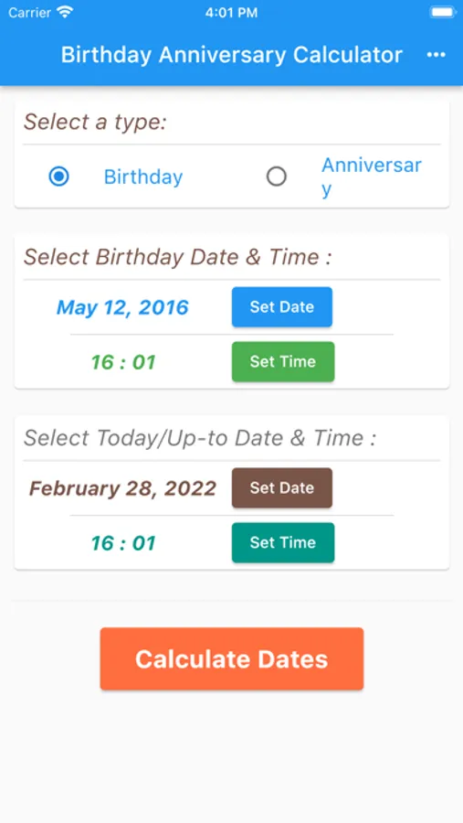 You can also plan your anniversary by entering your anniversary date and seeing how many days or months are remaining to go. Find total minutes and seconds you are being togther in this awesome journey.