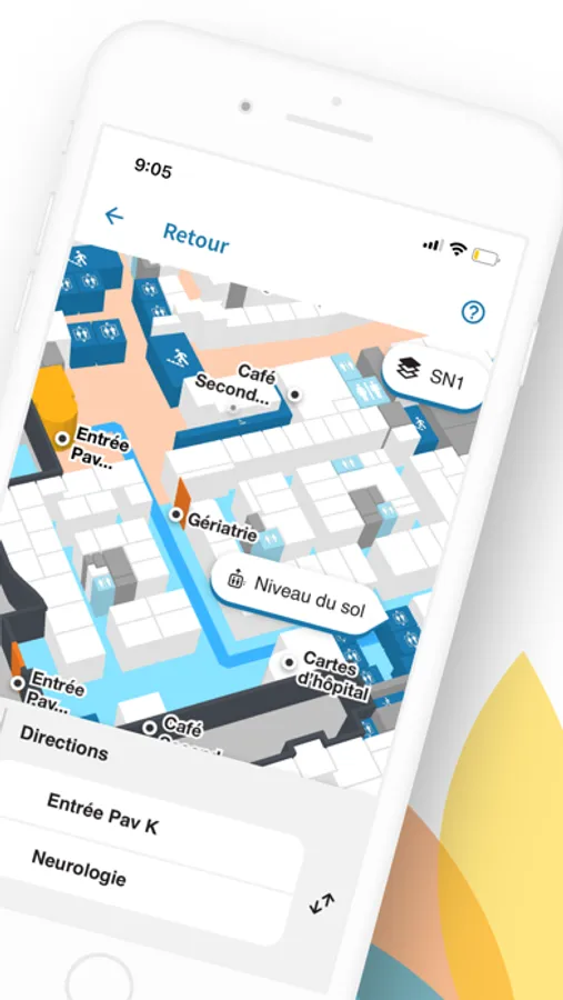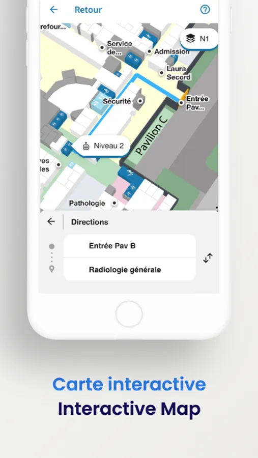 1) Aider les usagers à trouver leur chemin dans l'hôpital et aider à une navigation efficace dans l'hôpital. Des instructions écrites étape par étape sont fournies pour aider à trouver le chemin du point A au point B.