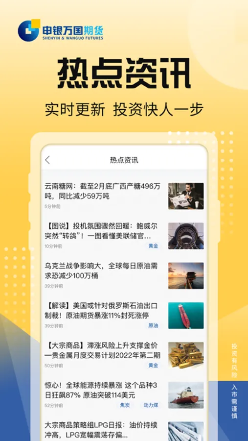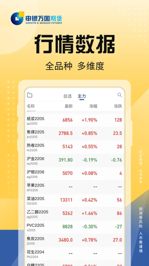 申银万国期货通APP是申银万国期货有限公司自主研发的移动端一站式期货投资平台!申银万国期货通APP不仅支持期货行情交易,包括商品期货、股指期货、商品期权、原油期货等,还提供了期货入门知识、风险管理以及投资咨询等各类金融服务。