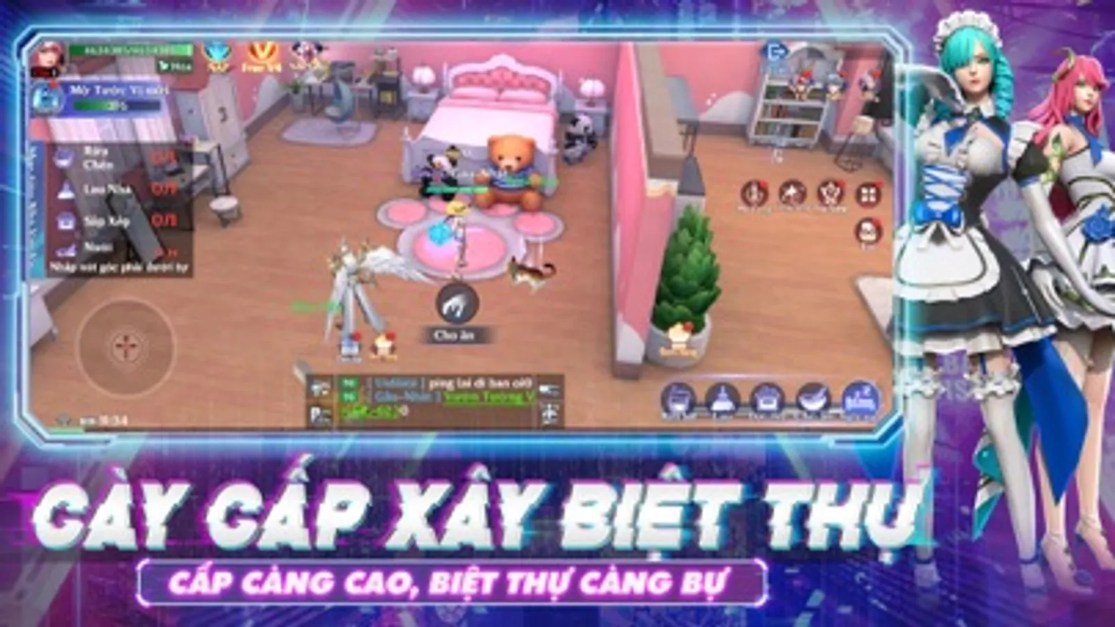 Sở hữu ngay biệt phủ chính chủ giá 0 đồng mang phong cách cyberpunk khi tham gia game. Hãy giúp cho căn biệt thự thật khang trang với những nhiệm vụ nhỏ như nuôi thú cưng, dọn dẹp nhà cửa. Đừng lo lắng nếu bạn quá bận rộn PK mà bỏ lỡ việc nhà bởi Cô quản gia xinh đẹp và chu đáo sẽ đồng hành cùng bạn.