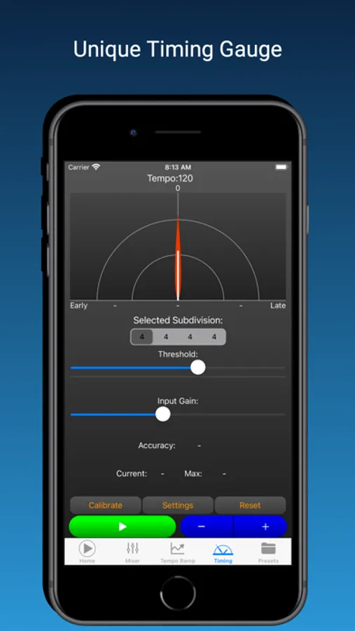 - The fun and unique Timing Gauge uses the microphone to assess the user's rhythmic accuracy, providing realtime visual and statistical feedback on your rhythmic tendencies. Quick calibration and customizable settings ensure accurate and meaningful readings.