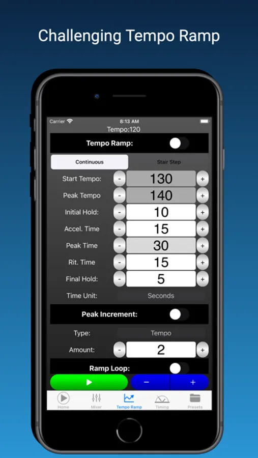 - A central feature of The Gnome, the Tempo Ramp provides simple tempo and time automation. In Continuous Mode, you can gradually speed up toward a 'peak' tempo, hold that tempo for a specified length of time (measured in either seconds, or beats) and then slow back down to the starting tempo. The peak tempo or peak time can gradually increase with each ramp cycle, ensuring that you push yourself a little faster, or hold your peak tempo for a little longer with each repetition. In Stair Step mode, The Gnome will hold the specified tempo for the specified amount of time (again, measured in seconds or beats) and then increment toward a goal tempo or time. Great for individual practice, as well as ensemble rehearsals, this feature is easy to set up and designed to be simple and practical.