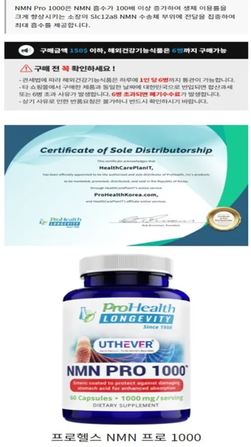 프로헬스는 세계에서 가장 깨끗하고 안정적인 제약 등급을 갖춘 NMN을 제공하는 Uthever 제품을 사용하며,