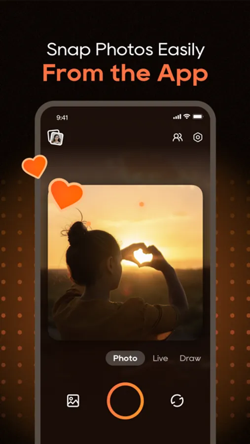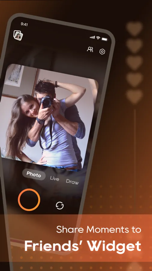 In this photo sharing app, users exchange pictures and videos directly on home screens, add drawings and stickers, and record short videos. Includes support for live photos, smooth video recording, drawing tools, stickers, and cross-device sharing.