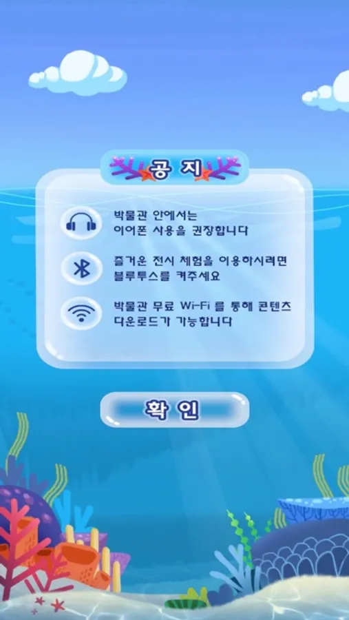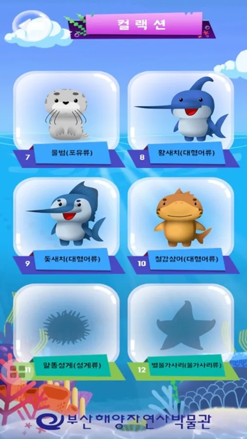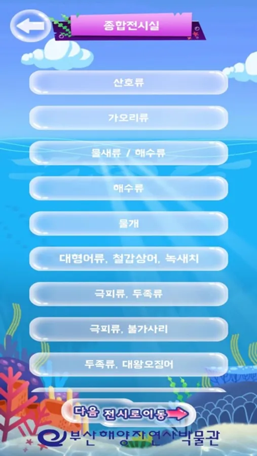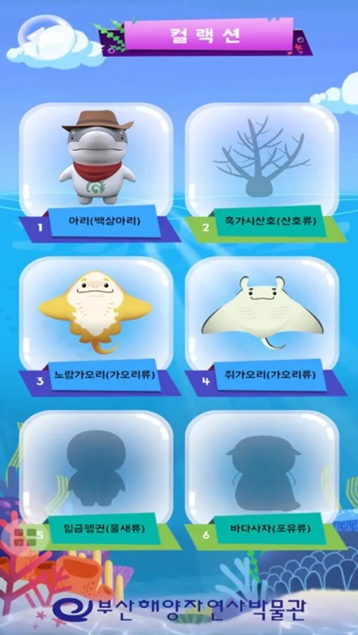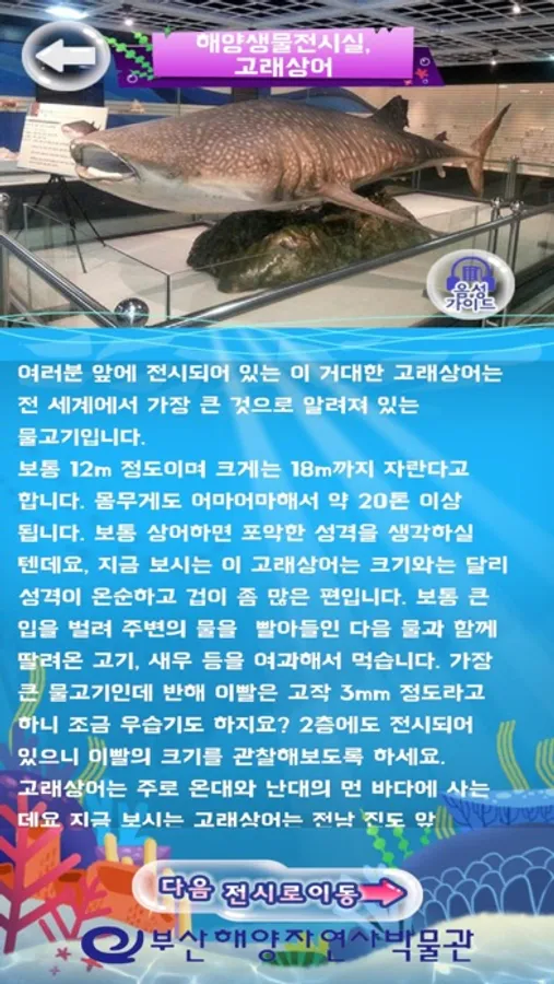 백상라리 캐릭터인 아리와 함께하는 살아있는 해양탐험 앱은 해양자연사박물관 내 생물 전시물에