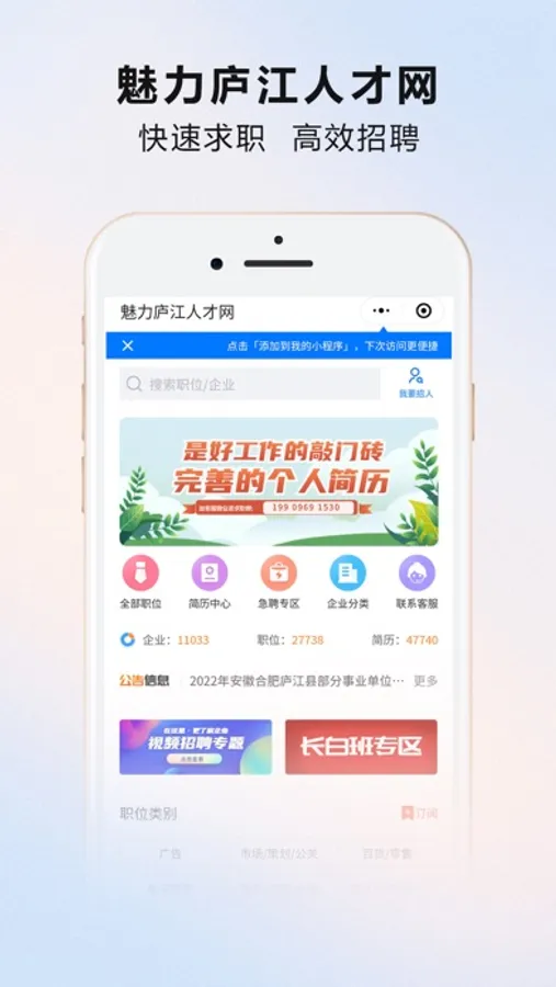 庐江招人、找工作,就看魅力庐江人才网! 魅力庐江人才网是庐江节点人力资源管理有限公司旗下招聘网站,致力于为求职者提供庐江本地优质招聘信息,为企业提供招聘渠道,帮助每一个求职者在魅力庐江人才网找到合适的工作! 魅力庐江人才网,搜索好工作!