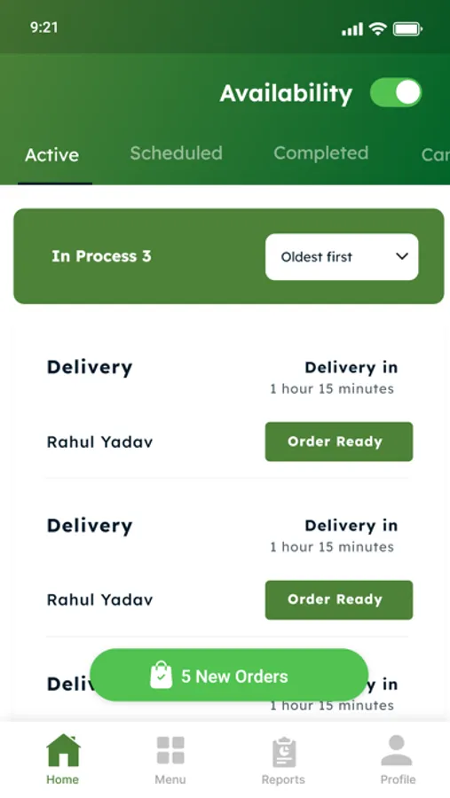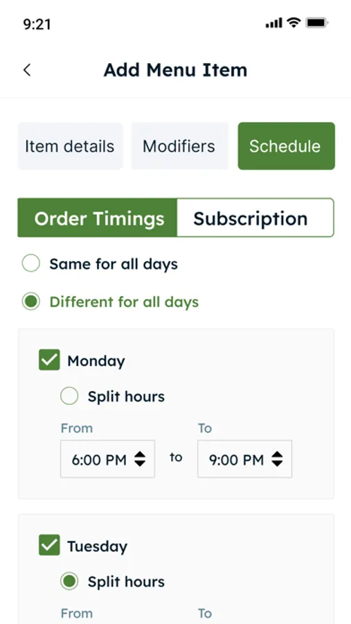 Schedule management - update your kitchen and item availability on the app. User can switch off the kitchen with a single click in case of personal exigency