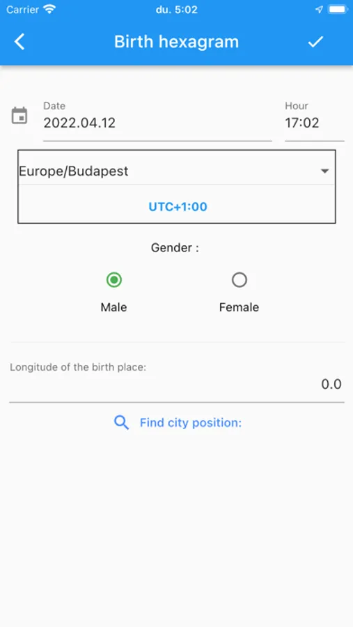 This is a Ji King hexagram generator app. There is two main working mode. First is the birth date hexagram generator. You give your birth date time, time zone, place longitude and gender information. The second mode is the transit hexagram generator. You should only give the gender information, the app calculate the hexagram from the current time and the current longitude position.