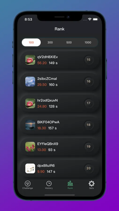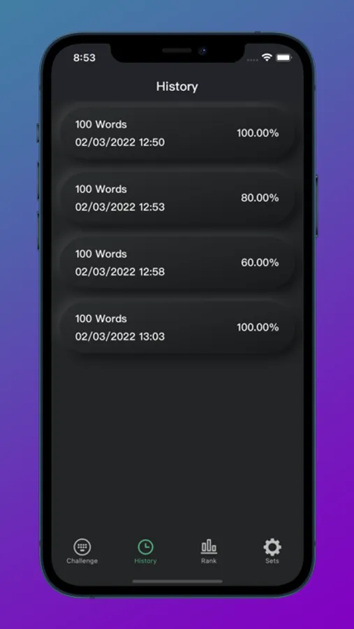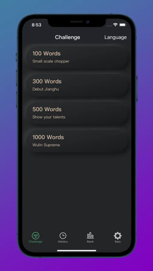 The app is designed to improve users' typing skills, with training divided into 100 words, 300 words, 500 words and 1,000 words