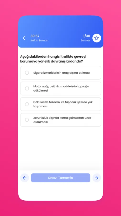 Sürücü Ehliyet Sınavına hazırlanmanın en iyi yolu pratik yapmaktır. Bu yüzden en iyilerle pratik yapın! Türkiye ehliyet sınavları için en kapsamlı veritabanını, hazırlık seviyenizi değerlendirmenize yardımcı olacak bir test simülasyonu modunu ve hatta en eksiksiz sürücü eğitimi deneyimi için çevrimiçi bir video kursunu sunuyoruz.